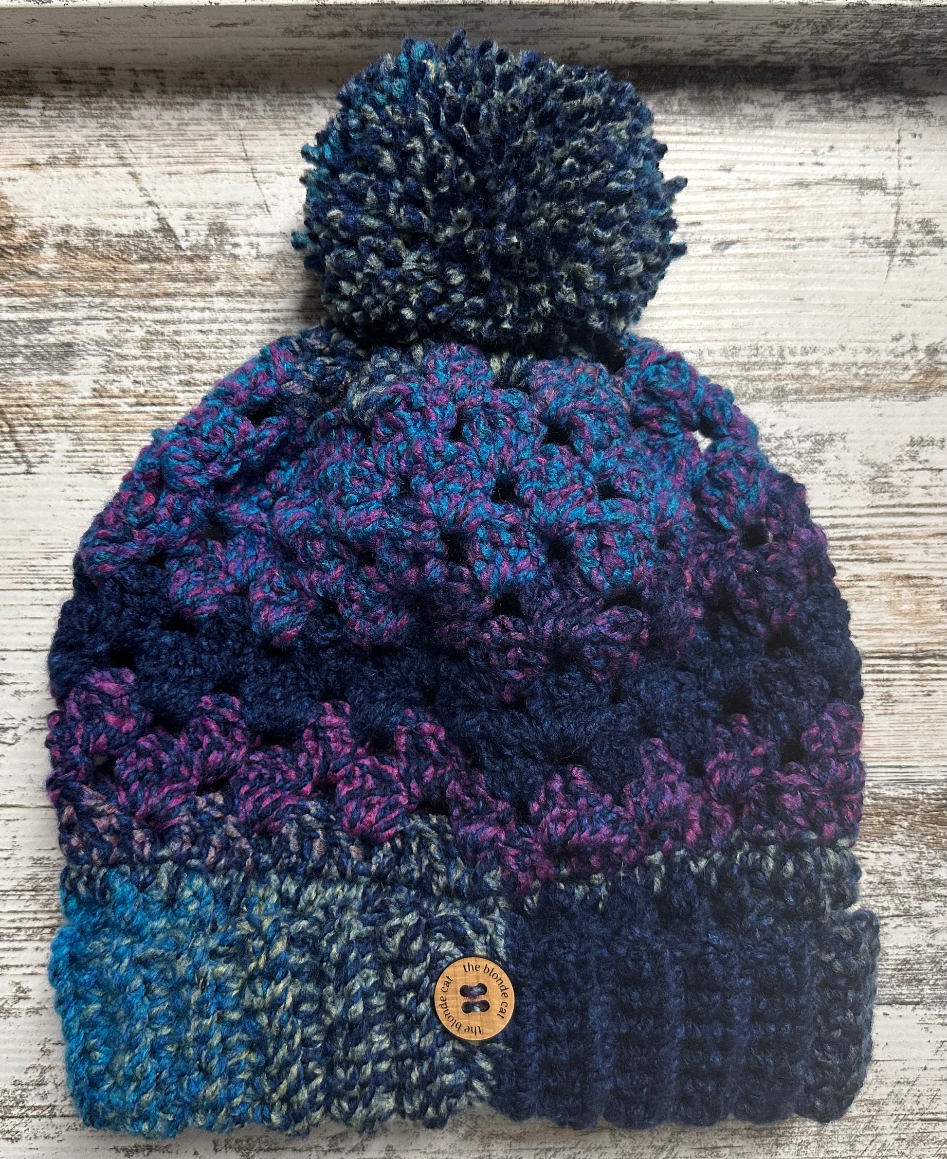 The back of the hat has a wooden button engraved with 'The Blonde Cat'.