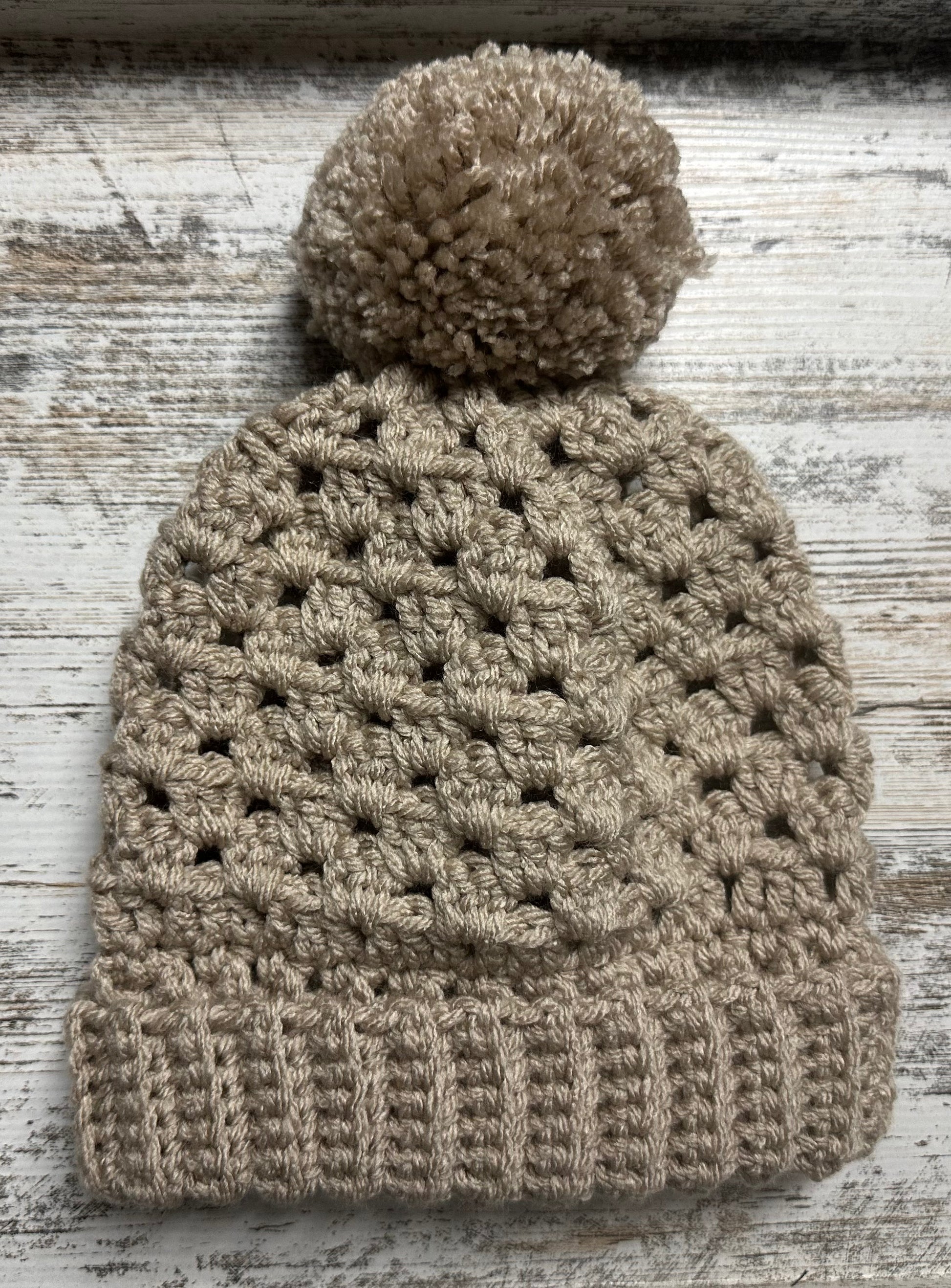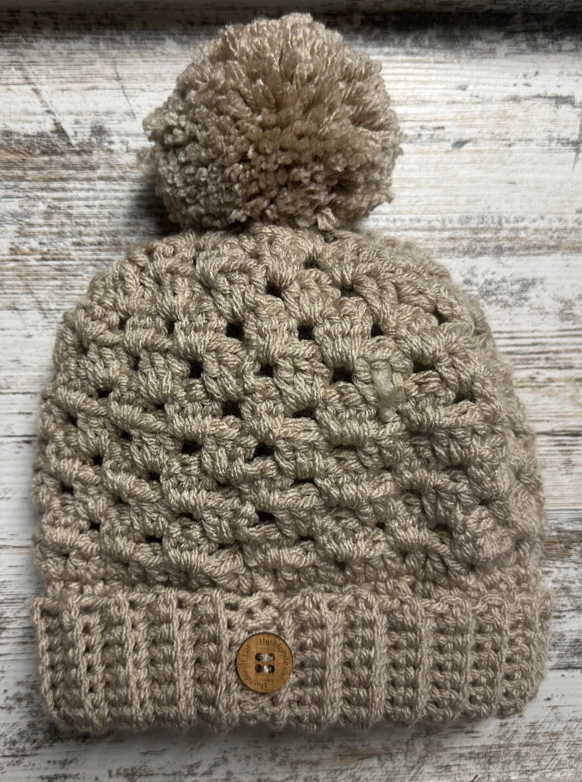 Crochet pom pom hat.